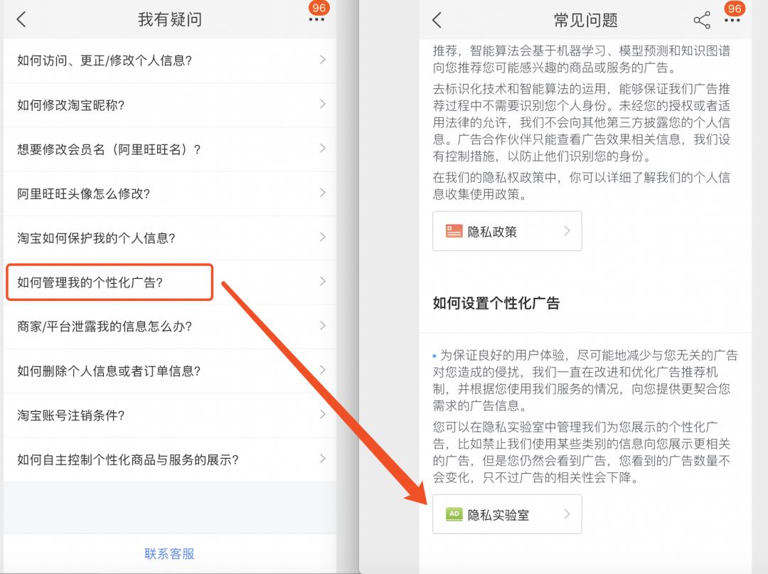 同样,淘宝的个性化广告设置关闭行为只能持续6个月,也就是说,6个月后,需要重复上述操作。 律师有话说 当数据逐渐渗透到现在各行各业的不同功能领域,都将可能成为不可或缺的生产因素。而人们对于海量数据的关联关系挖掘和生产实践运用,即可预示新一波生产率增长和消费者盈余的走向。个人信息的重要性不言而喻,2020年5月28日通过的《民法典》也明确了其法律地位和数据在收集、存储、使用、加工、传输、提供、公开等流转过程中的管理规范。但是,当前许多APP运营者仍通过变相的许可方式采集用户的相关个性信息以精准推送,可谓是用户对产品体验的一种妥协。相信随着APP市场的发展和法律规制的不断完善,相关的个性化推送监管将会逐步严格,用户也将享有更多的“隐私”空间。 , 为什么淘宝总是向我推送个人近期搜索的产品? 为什么朋友圈的广告总是正中我的喜好? 手机到底有没有偷听我的语音? 大数据怎会如此懂我的心?
